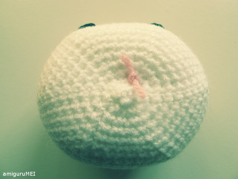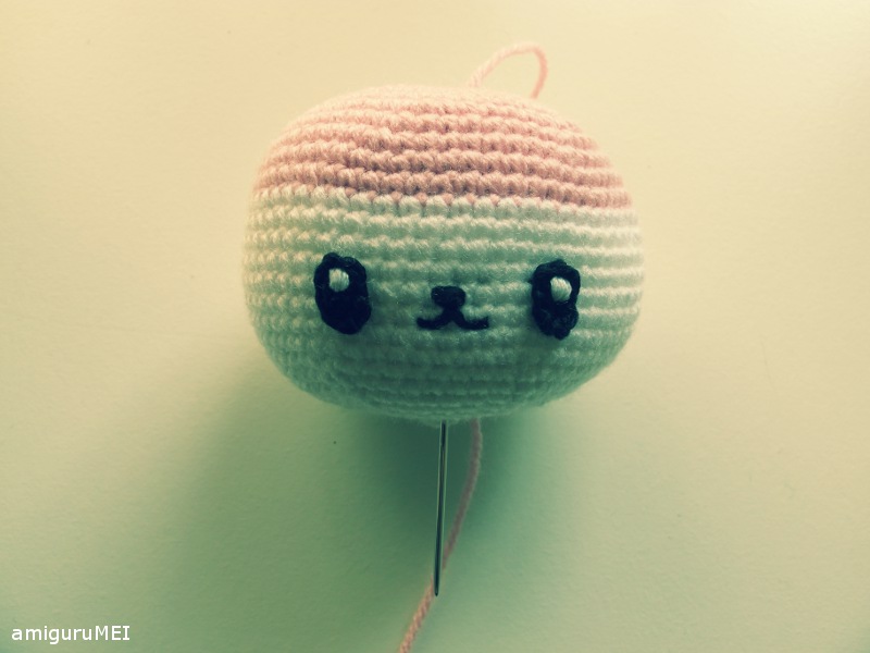 Thread the yarn through from the bottom part of Pandapple-chan’s head, to the top part of the head, in the centre.
