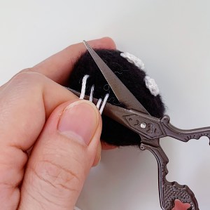 - After you’ve achieved the “desired” fuzziness, sew on the eyes, with a small gap in between the two.