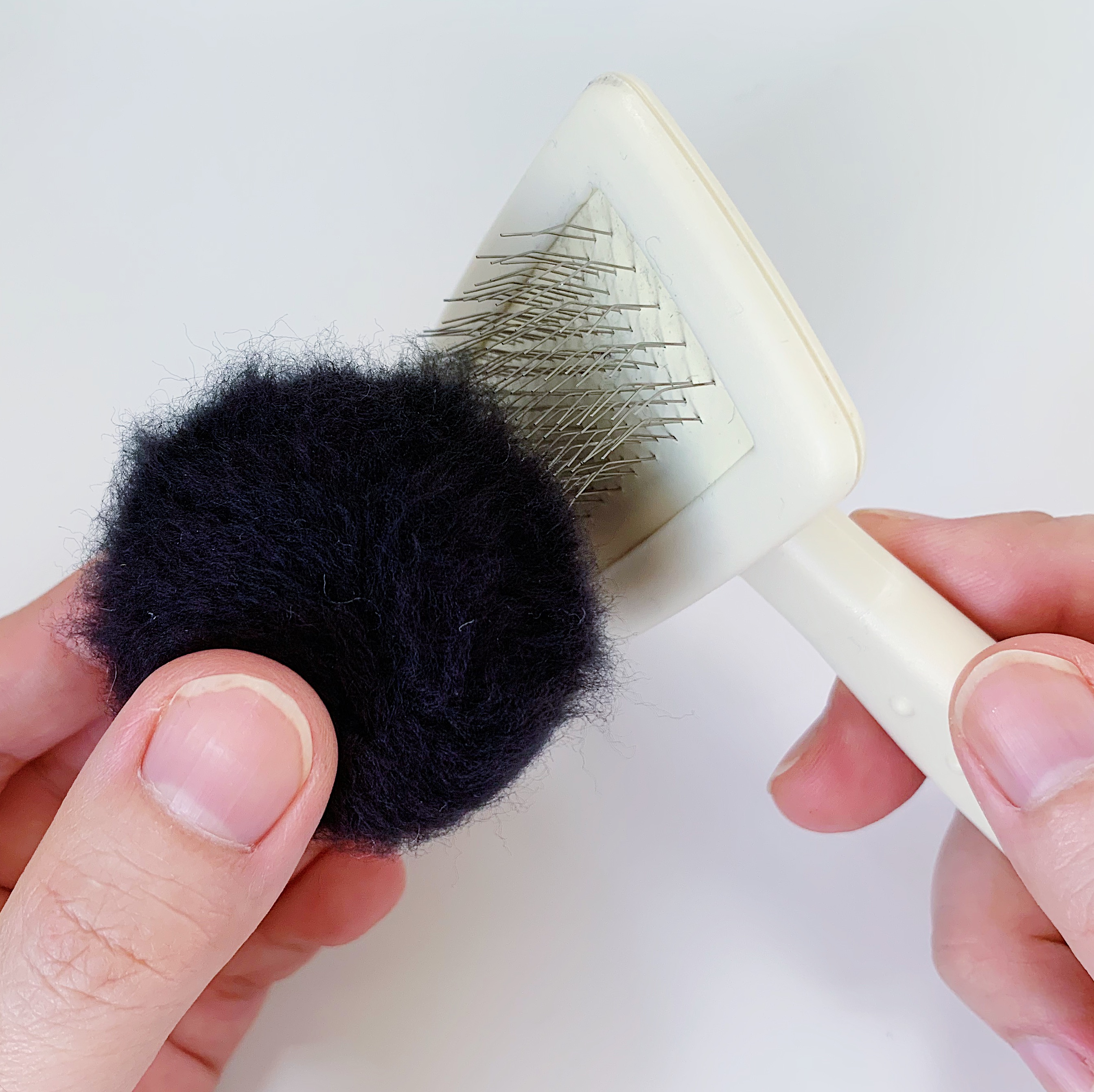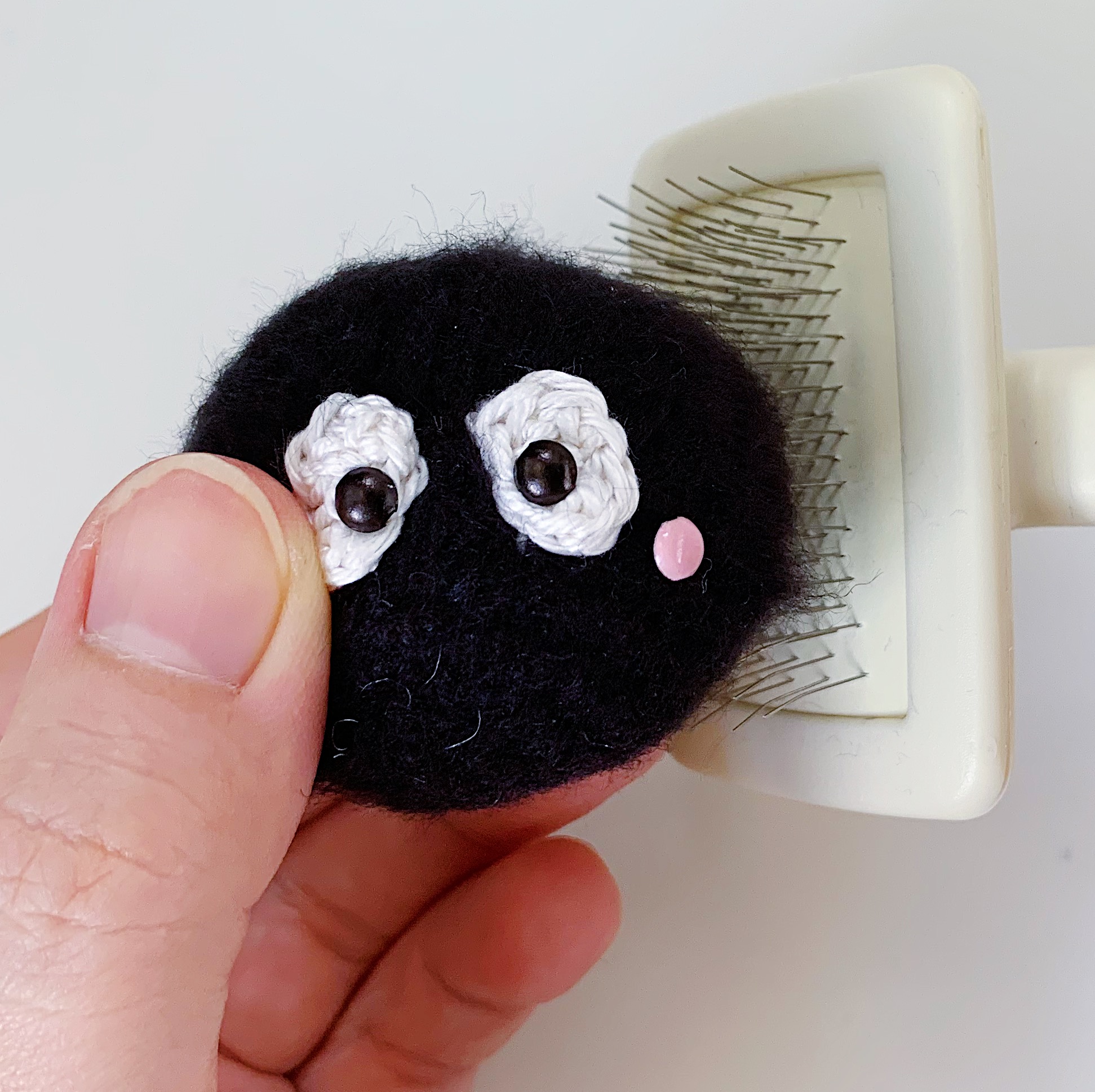 - Start fuzzing up your soot sprite – use your pet slicker to brush all over the main black body. Remember to do this before you attach the eyes (so you won’t fuzz up the eyes too!)