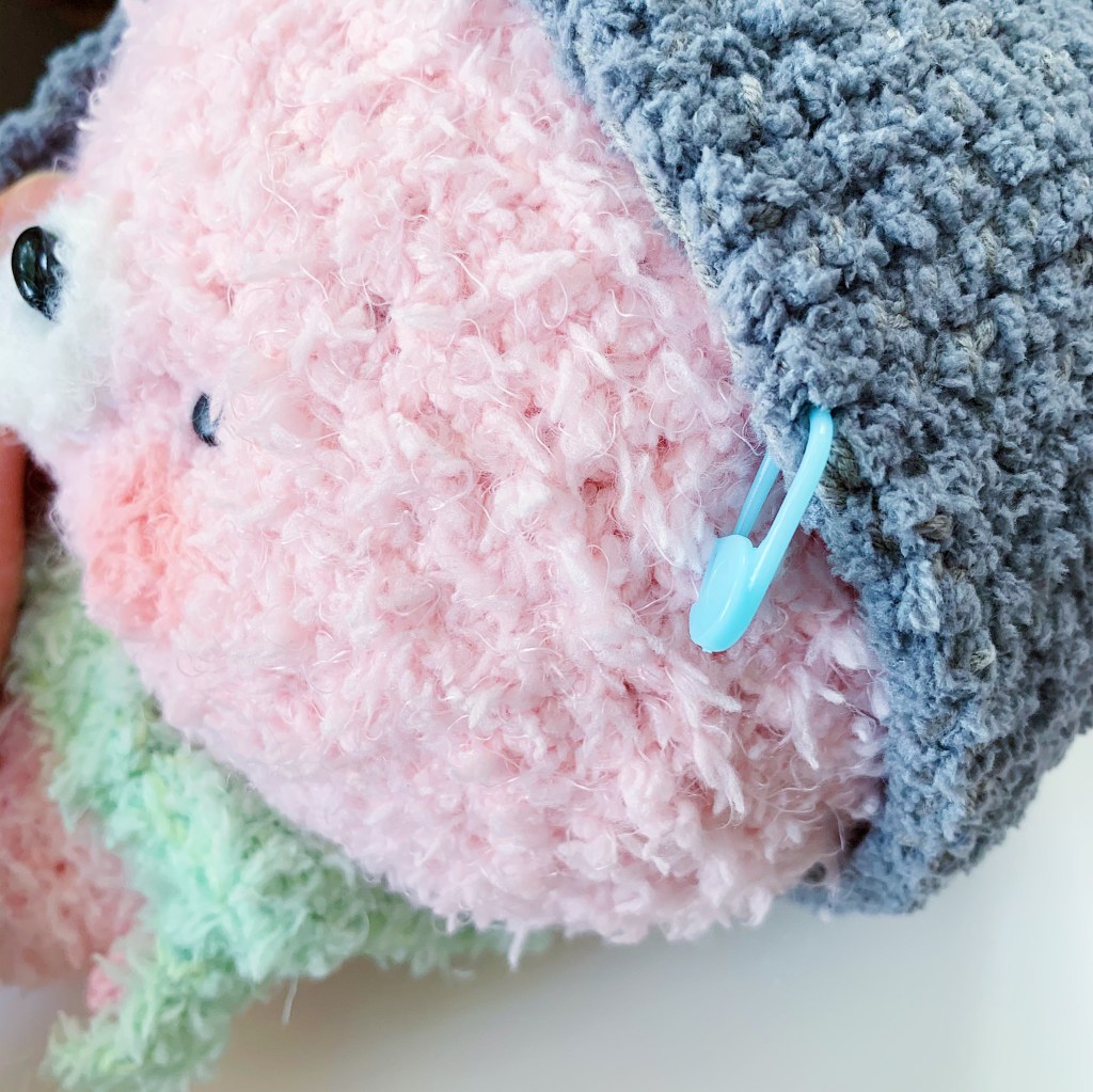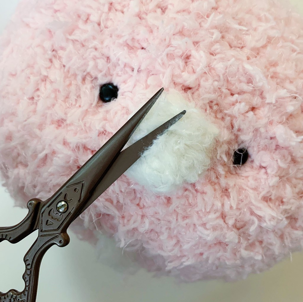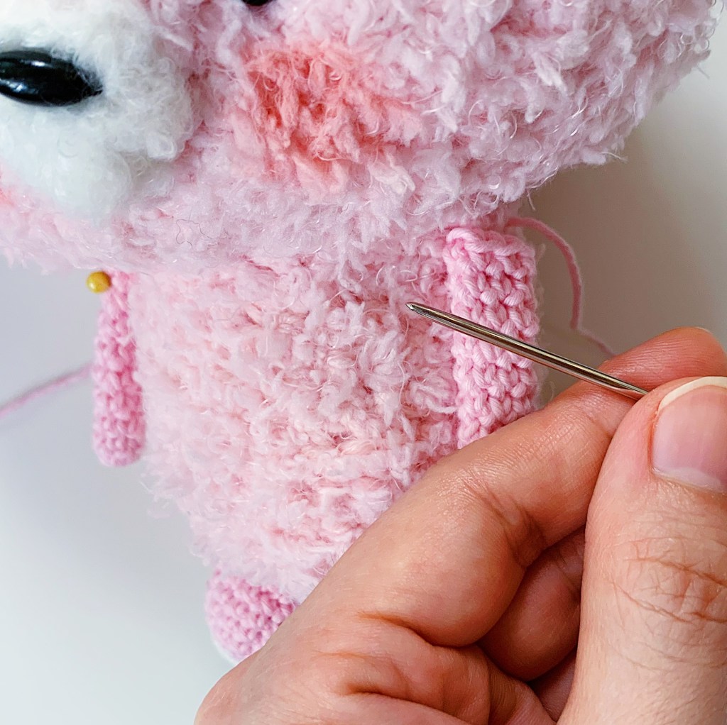 **If it is too difficult to sew with the paired-up yarn, just hide the fuzzy yarn by pulling it through the doll, and use the remaining normal yarn for securing.