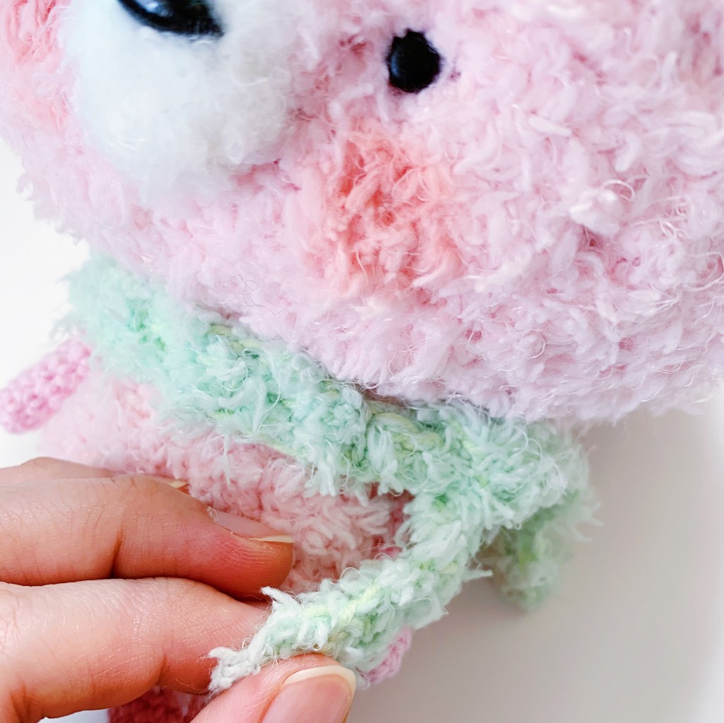 Continue until your scarf measures about 34cm in length, then check if it can loop comfortably around Mei-chan’s neck.