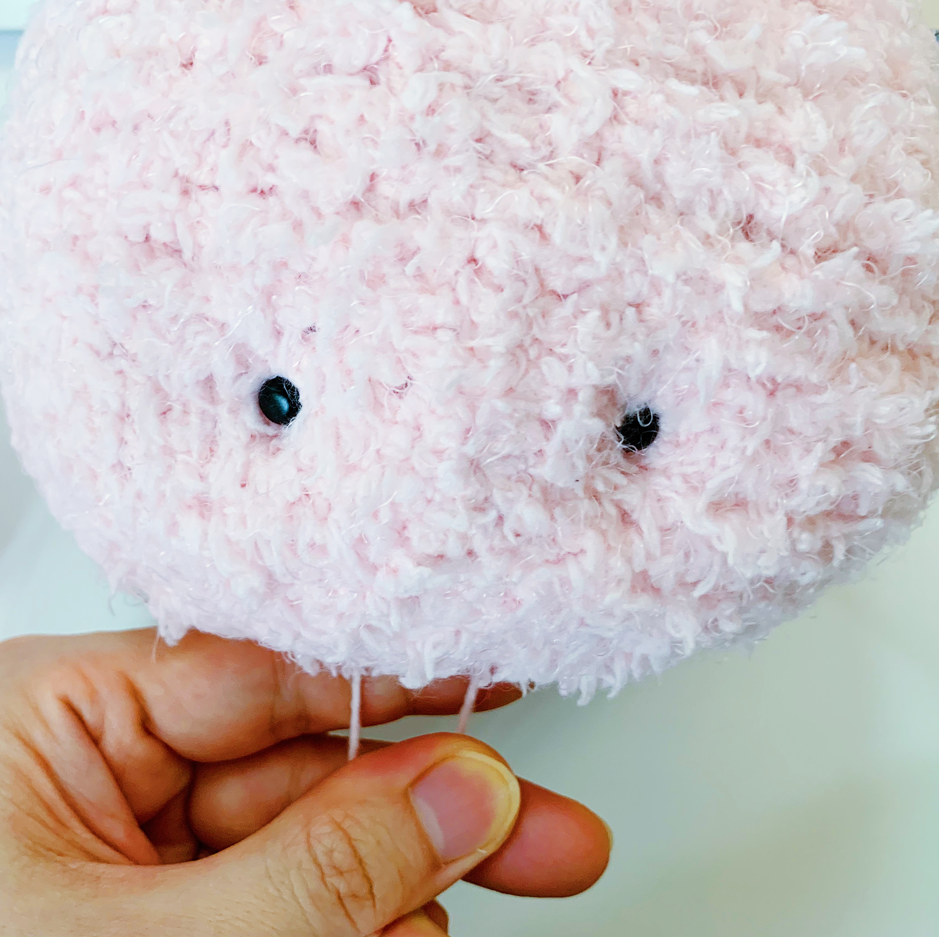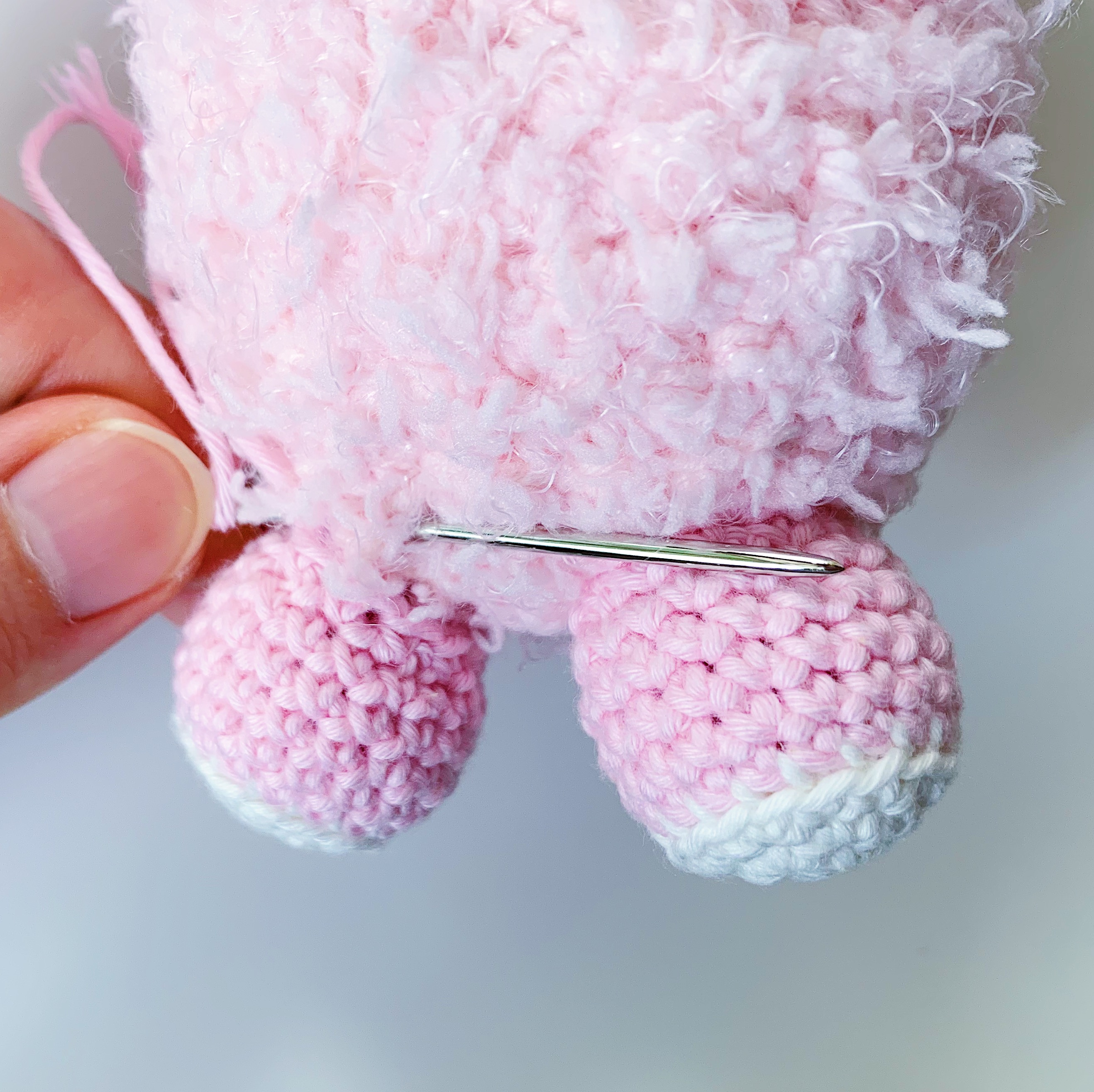 **If it is too difficult to sew with the paired-up yarn, just hide the fuzzy yarn by pulling it through the doll, and use the remaining normal yarn for securing.