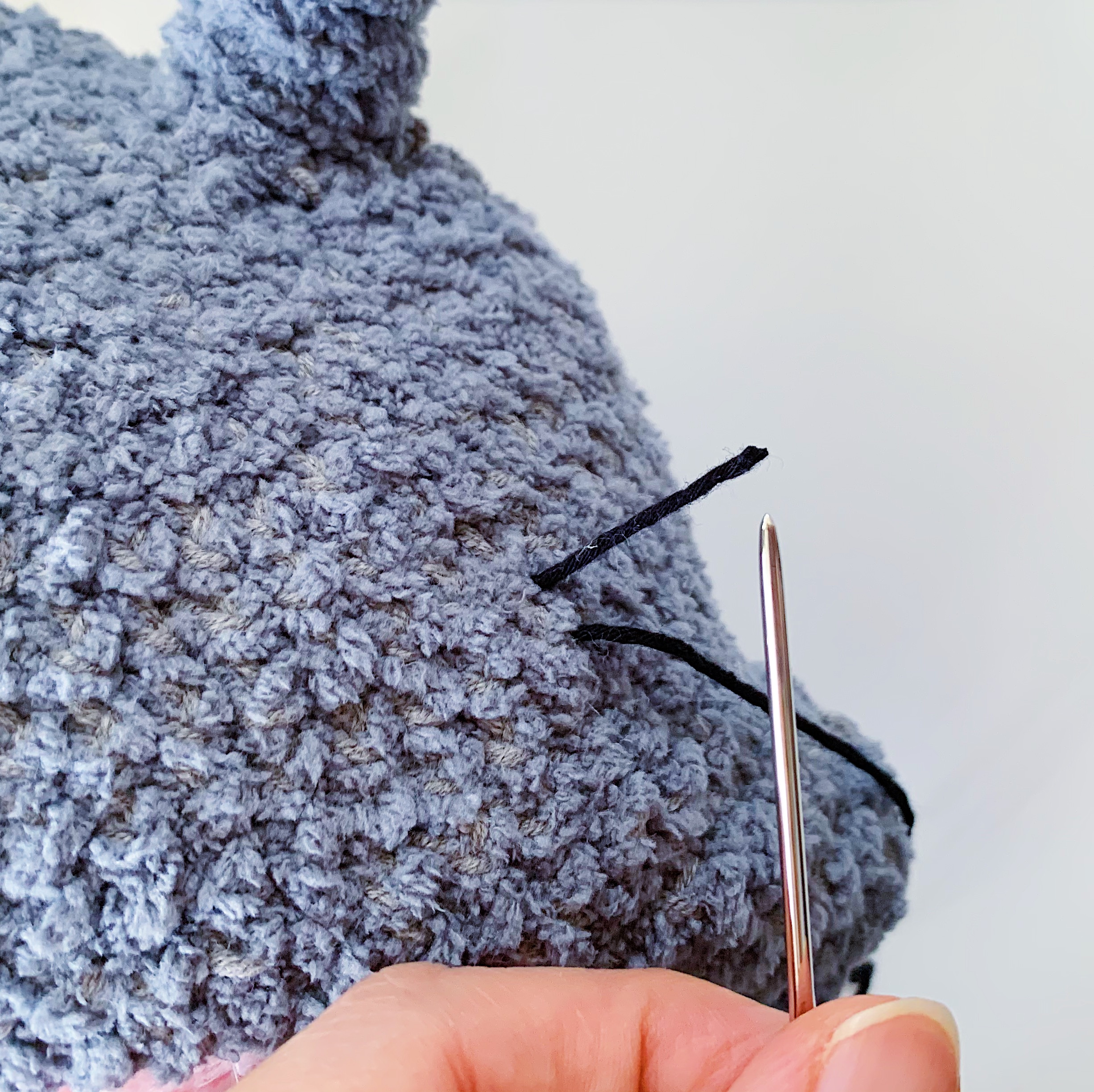 - To make the whiskers, loop and sew on a strand of black yarn as shown in the pictures.